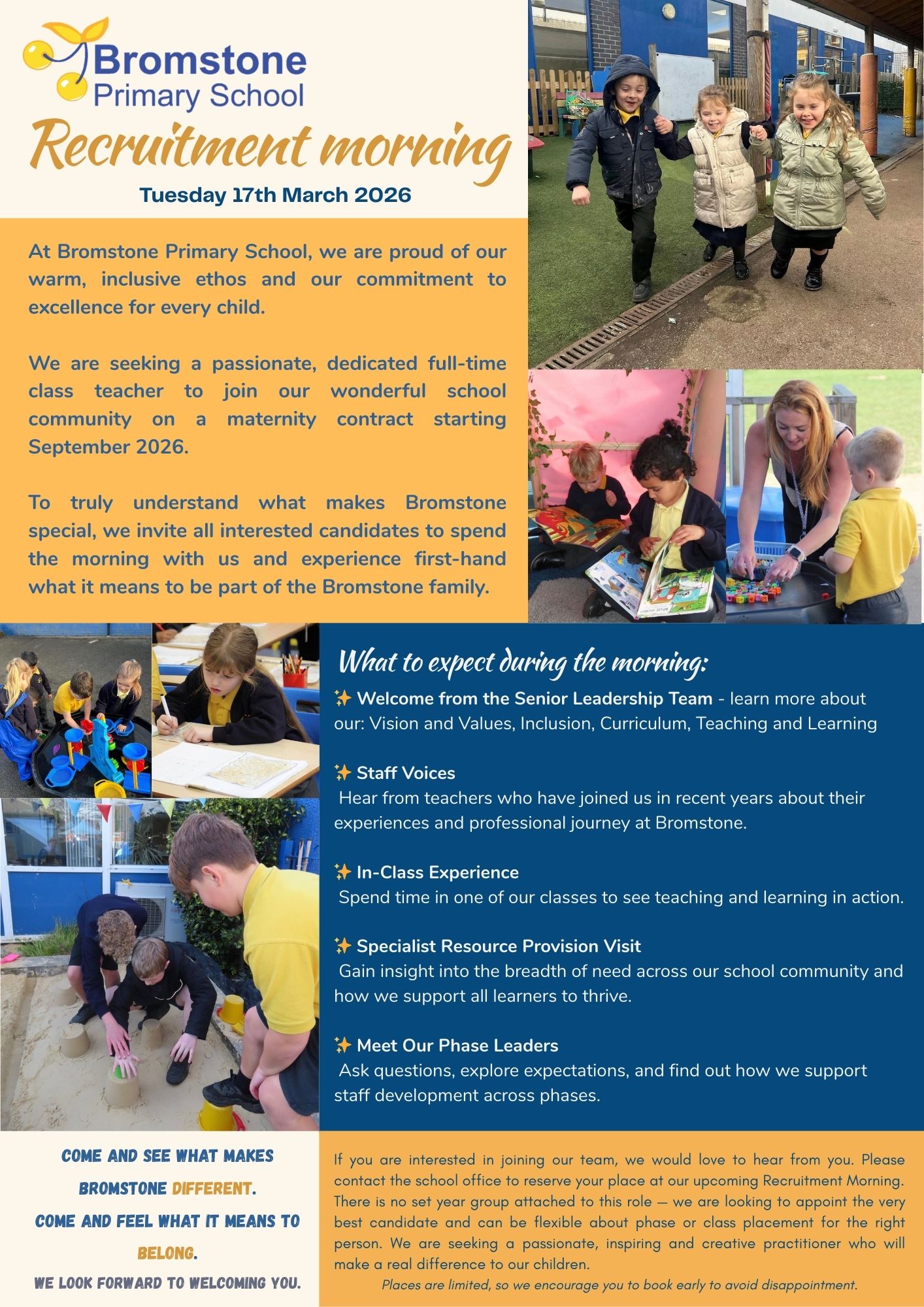 We are hosting a Recruitment Morning for this role on Tuesday 17th March, 9:15am, to give candidates a chance to tour the school, meet staff and children, and experience the Bromstone way. Spaces are limited to 20 participants initially.