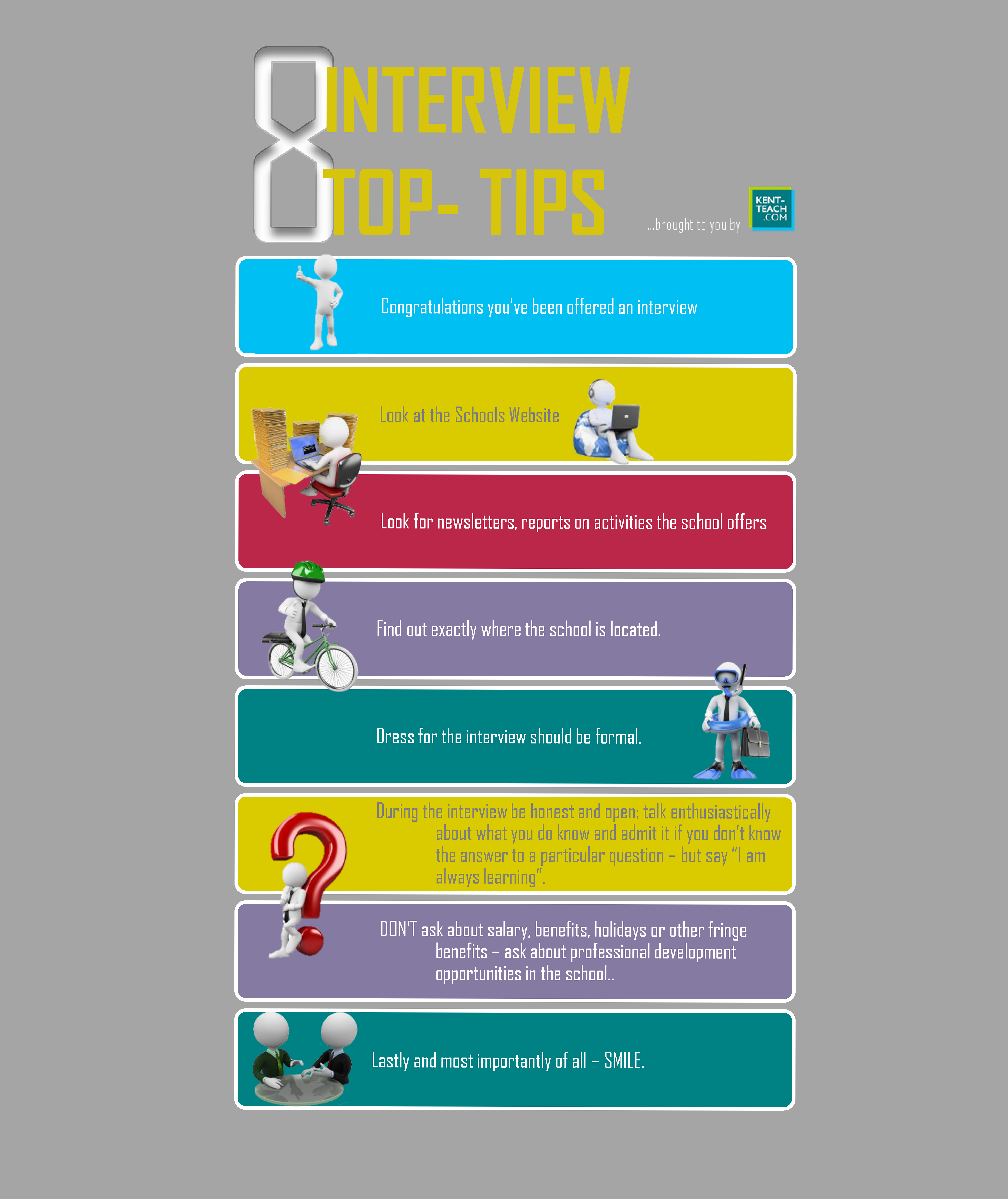 Interviews are an inevitable, and crucial, part of going for a new job. It is normal to feel nervous at the prospect of an interview. However, it is important to remain calm, level-headed and confident. Remember, your application impressed the school hence your invitation to interview.